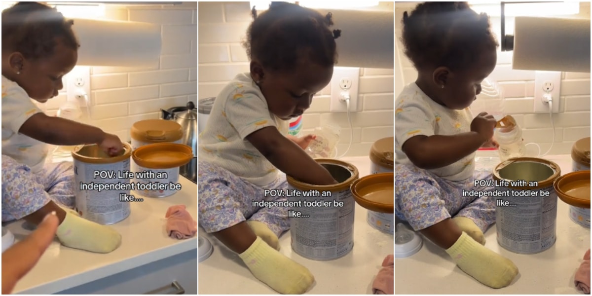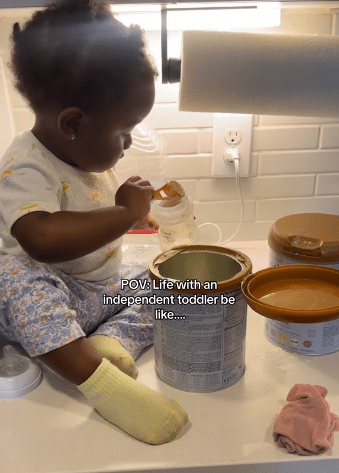 The video showcased her toddler daughter perched atop a kitchen cabinet, diligently preparing her own bottle of milk with the utmost seriousness.