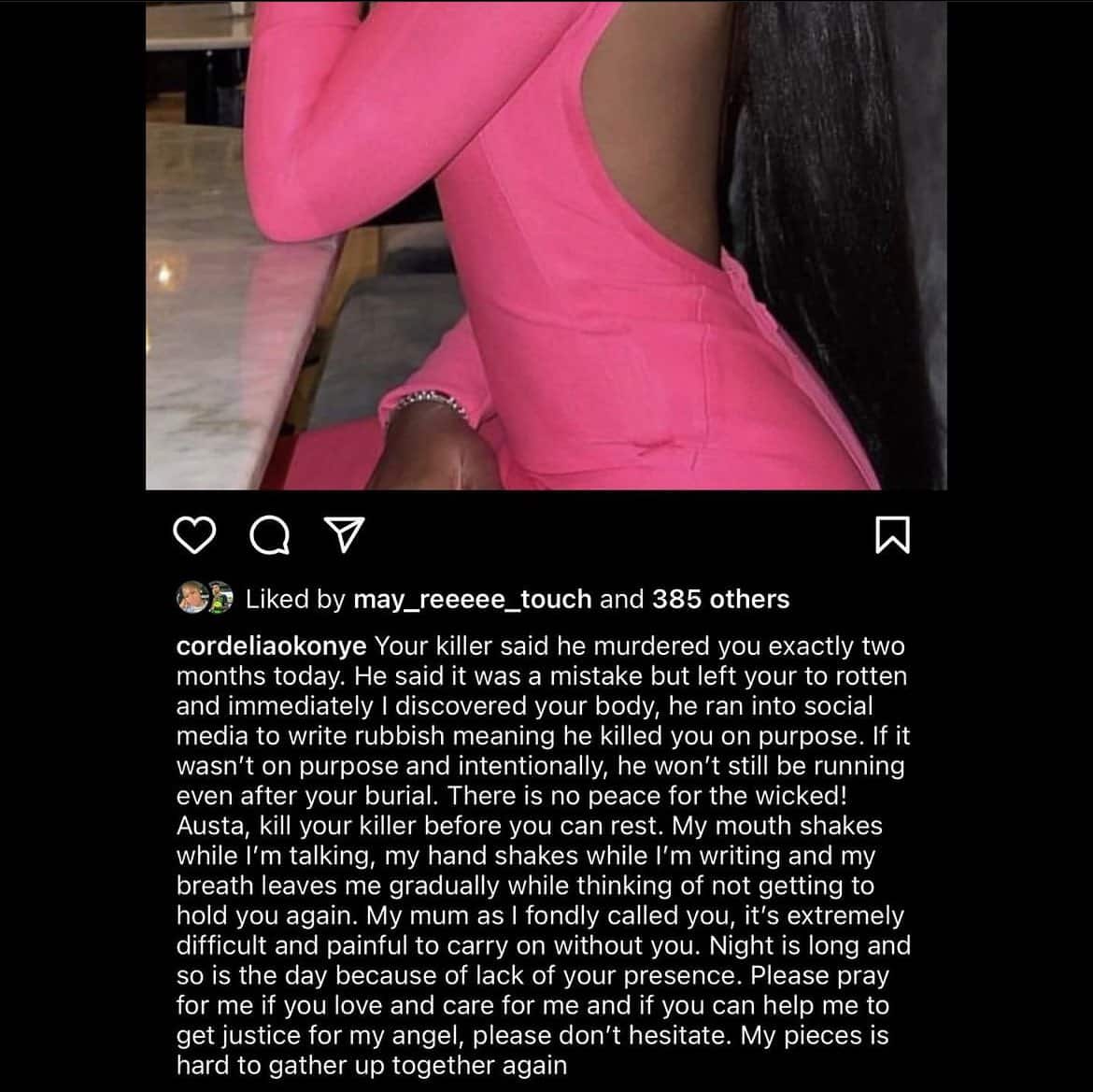 The mother of the 21-year-old lady identified as Austa who was murdered by her boyfriend finally breaks her silence.