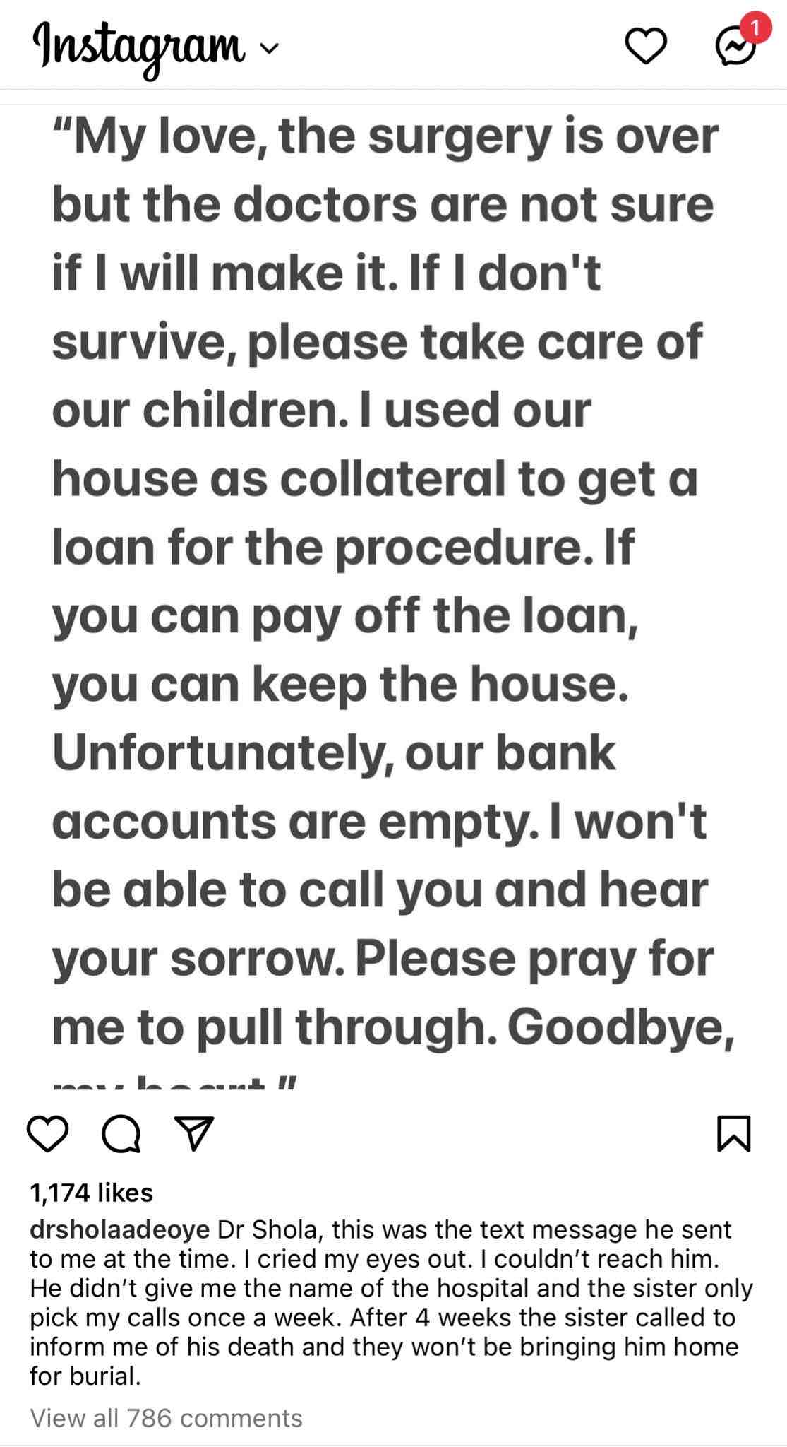 A Nigerian mother of three kids recounts how her husband flew to America for cancer treatment but faked his death and started a new life with another woman.