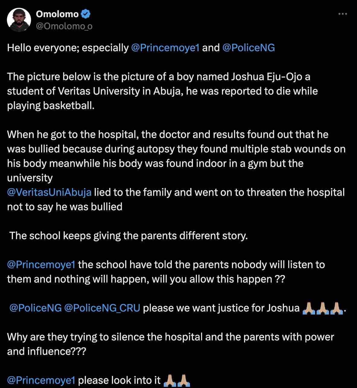 @PoliceNG @PoliceNG_CRU please we want justice for Joshua 🙏🏽🙏🏽🙏🏽.