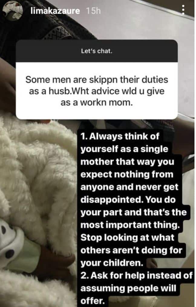 “Always think of yourself as a single mother, that way you expect nothing from anyone and never get disappointed. You do your part and that’s the most important thing. Stop looking at what others aren’t doing for your children. Ask for help instead of assuming people will offer”, she wrote.
