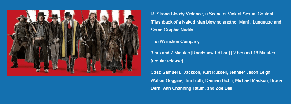 —u/berntgeo: “The Hateful Eight is the movie I’ve seen the most in my life. I love it, but it’s more because a surprising amount of people never gave it a chance, and it’s one of the best movies to just drop on friends and family who don’t know, completely raw and contextless. Everyone I’ve ever shown it to loved it and was engaged in the stellar cast and whodunnit angle.”