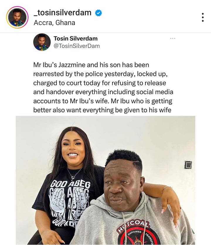 “Mr Ibu’s Jazzmine and his son has been rearrested by the police yesterday, locked up, charged to court today for refusing to release and handover everything including social media accounts to Mr Ibu’s wife. Mr Ibu who is getting better also want everything be given to his wife.”