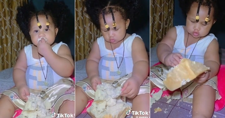 A TikTok user with the handle @mummy_onyii has shared a video of her one-year-old baby girl eating bread at midnight.