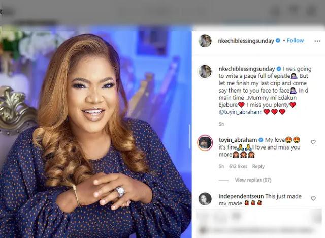 “I was going to write a page full of epistle.. But let me finish my last drip and come say them to you face to face ..In d main time ..Mummy mi Edakun Ejebure.. I miss you plenty @toyin_abraham.”
