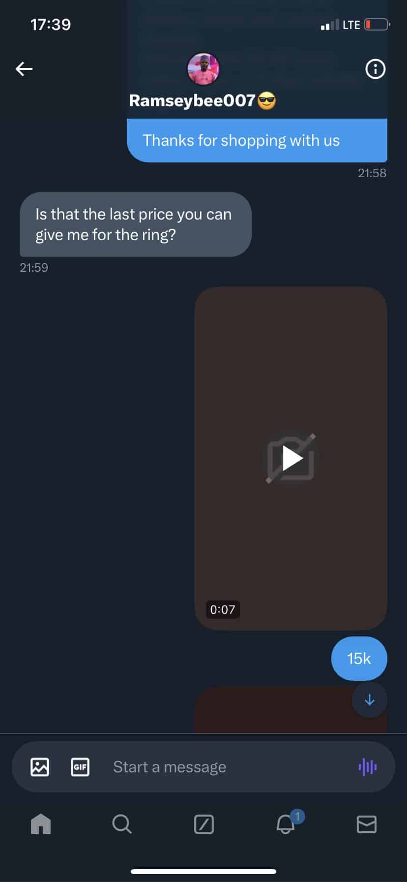 In the chat, Abiola had messaged the vendor requesting a ring for his wife but did not continue with the purchase due to a lack of funds.