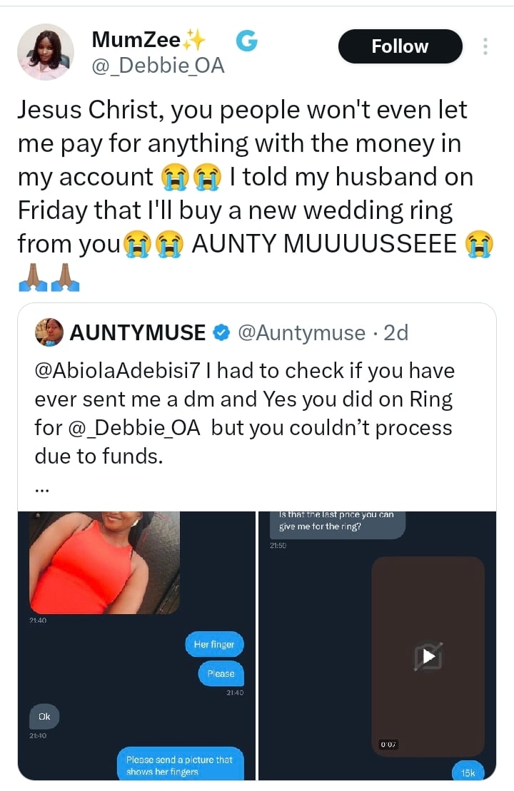 Reacting to the chat, Mummy Zee said: “Jesus Christ, you people won’t even let me pay for anything with the money in my account 😭😭 I told my husband on Friday that I’ll buy a new wedding ring from you😭😭 AUNTY MUUUUSSEEE 😭🙏🏽🙏🏽.”