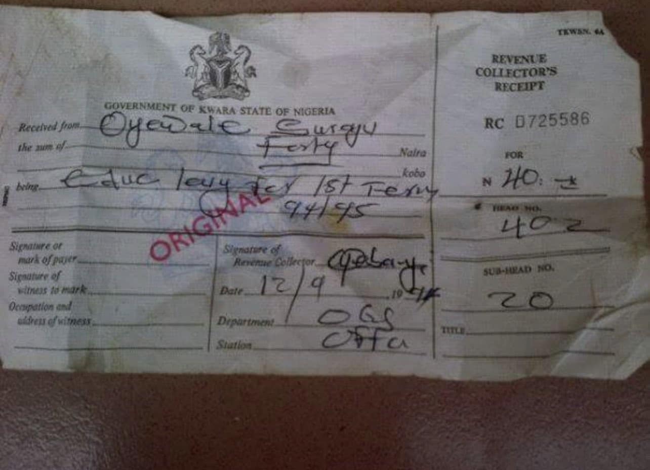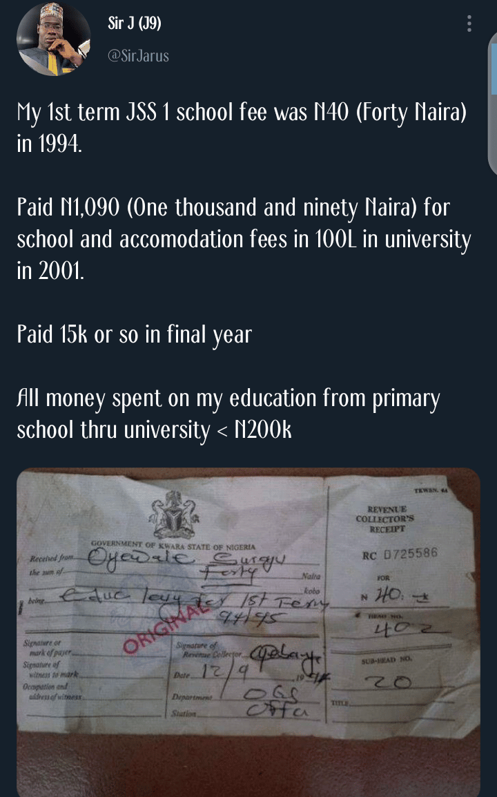 “My 1st term JSS 1 school fee was N40 (Forty Naira) in 1994. Paid N1,090 (One thousand and ninety Naira) for school and accommodation fees in 100L in university in 2001.