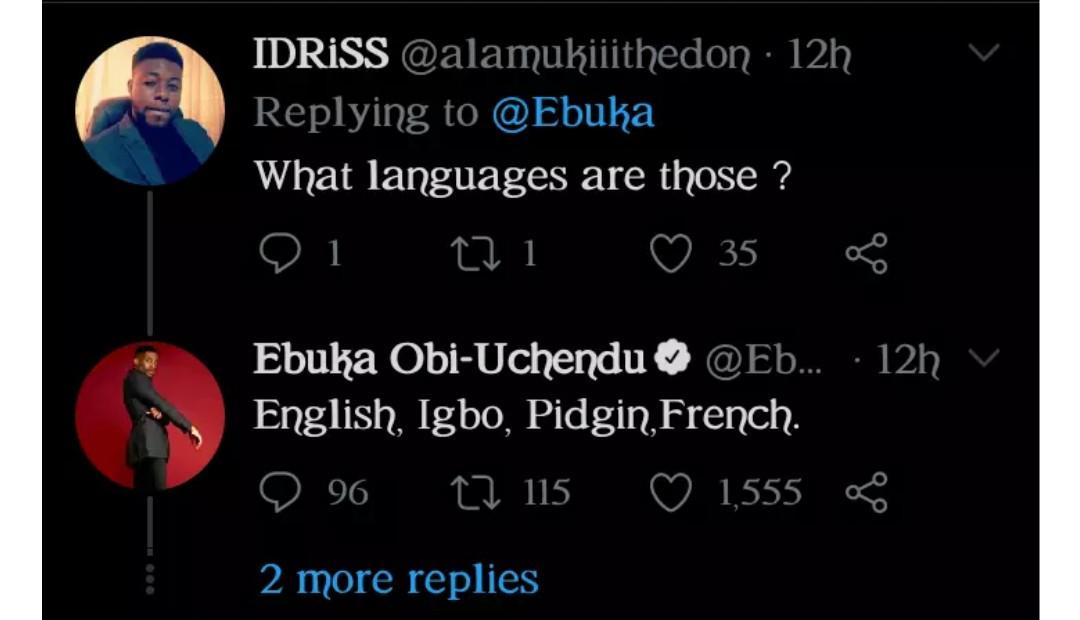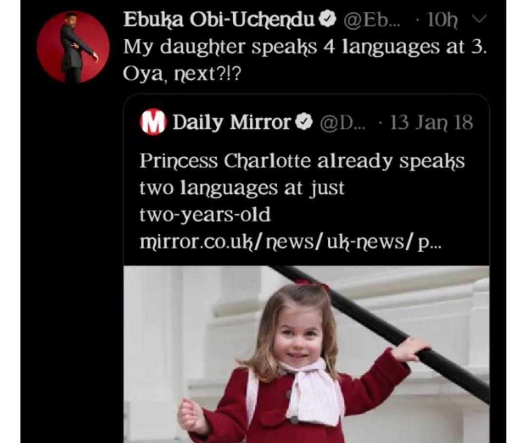 In order to show that his daughter is also exceptional, Ebuka replied the tweet saying his three-year-old girl now speaks 4 languages fluently, and when asked to mention the four languages, he said English, French, Ibo, and Pidgin English.