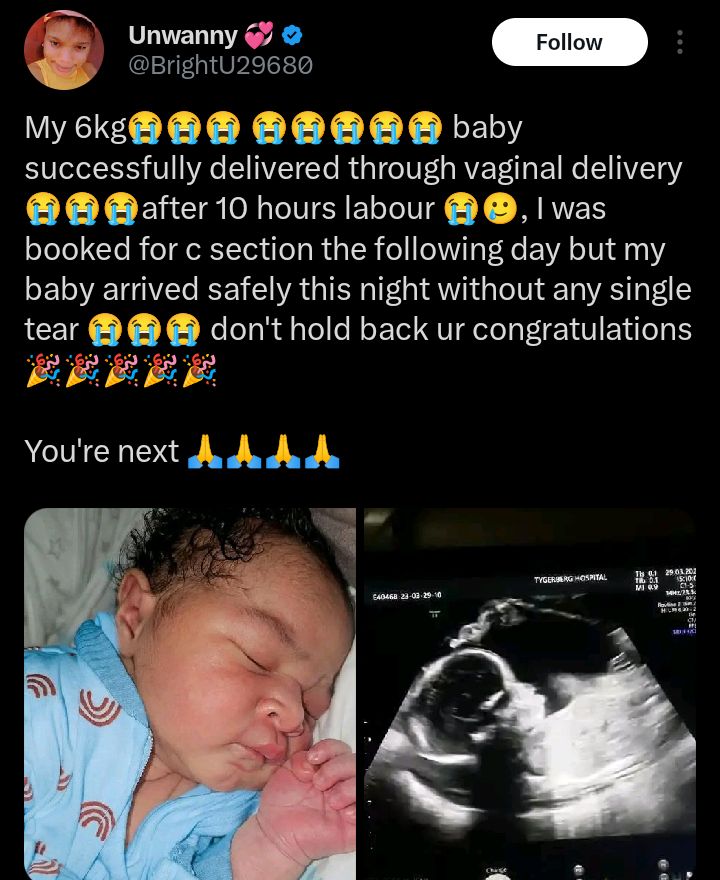 According to her account, she successfully delivered a 6kg baby through vaginal delivery after 10 hours of labour, despite being scheduled for a caesarean section the following day.