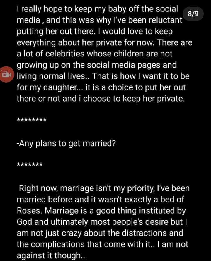 “I really hope to keep my baby off social media, and this was why I’ve been reluctant to put her out there. I would love to keep everything about her private for now. There are a lot of celebrities whose children are not growing up on social media pages and living normal lives.
