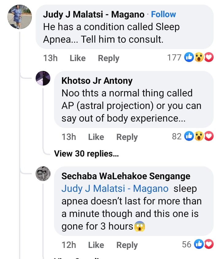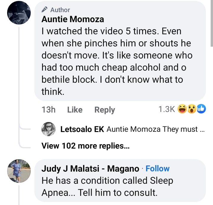“I watched the video 5 times. Even when she pinches him or shouts he doesn’t move. It’s like someone who had too much cheap alcohol and o bethile block. I don’t know what to think.”