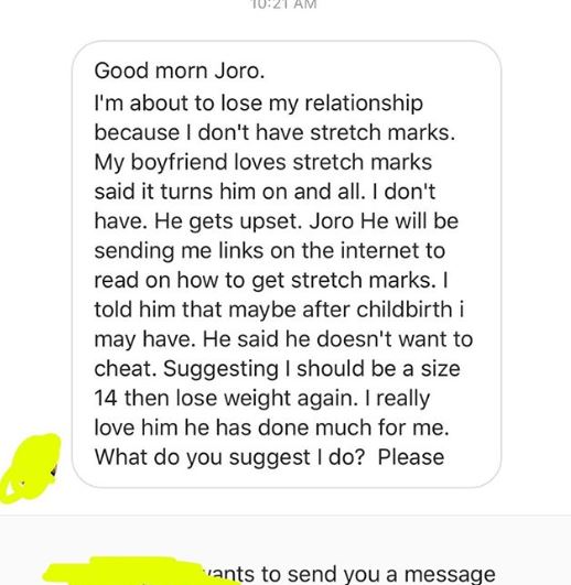 “Good morn Joro. I’m about to lose my relationship because I don’t have a stretch marks. My boyfriend loves stretch mark said it turns him on and all. I don’t have. He gets upset. Joro He will be sending me links on the internet to read on how to get stretch marks. I told him maybe after childbirth I may have. He said he doesn’t want to cheat. Suggesting I should be size 14 then lose weight again. I really love him he has done so much for me. What do you suggest I do? Please.”