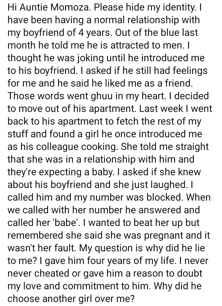 “Please hide my identity. I have been having a normal relationship with my boyfriend of 4 years. Out of the blue last month he told me he is attracted to men. I thought he was joking until he introduced me to his boyfriend. I asked if he still had feelings for me and he said he liked me as a friend. Those words went ghuu in my heart. I decided to move out of his apartment. Last week I went back to his apartment to fetch the rest of my stuff and found a girl he once introduced me as his colleague cooking. She told me straight that she was in a relationship with him and they’re expecting a baby. I asked if she knew about his boyfriend and she just laughed. I called him and my number was blocked. When we called with her number he answered and called her ‘babe’. I wanted to beat her up but remembered she said she was pregnant and it wasn’t her fault. My question is why did he lie to me? I gave him four years of my life. I never never cheated or gave him a reason to doubt my love and commitment to him. Why did he choose another girl over me?”