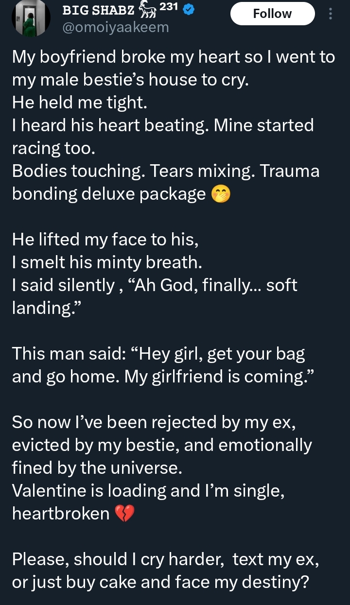 A viral post from a Lady on X (formerly Twitter) has captured the attention of social media users this week, blending heartbreak, humour, and awkward romance into a single thread.