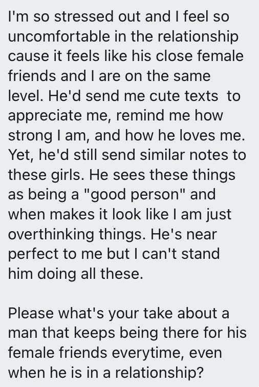 “Me and this guy have been dating for over a year and it’s like the best relationship I’ve ever been in. He’s caring, understanding and super patient. But one thing that gets me worked up is how very available and accessible he is to his female friends.”