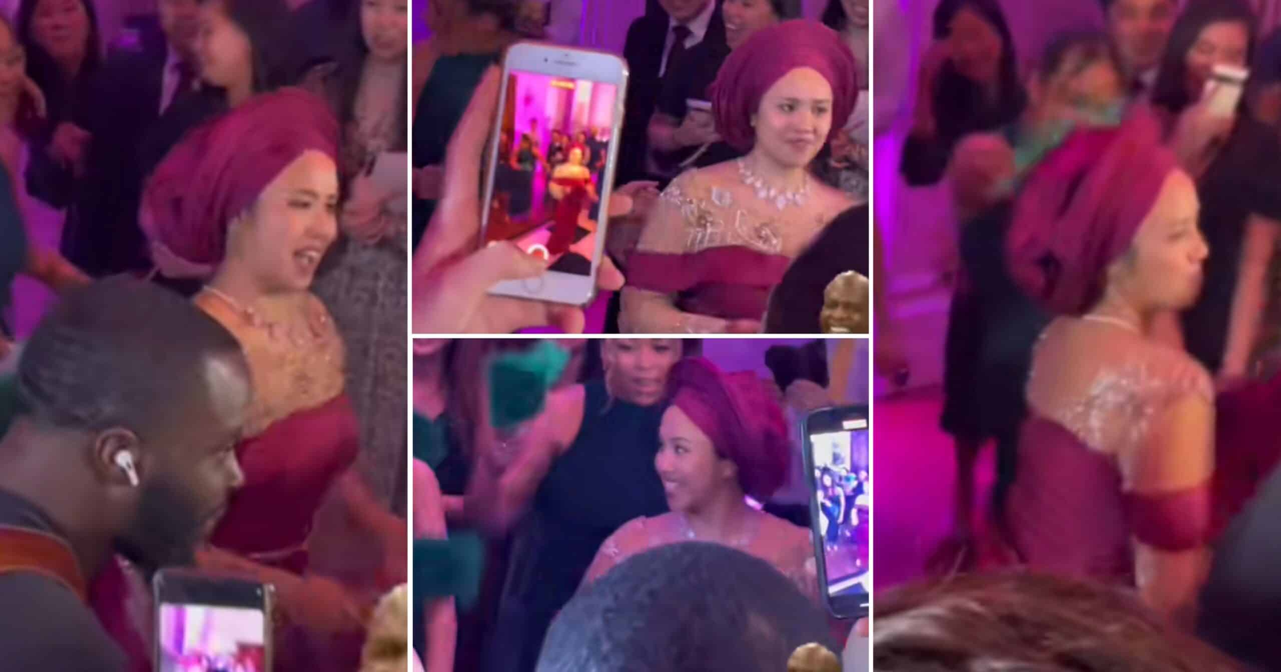 “My Chinese wife has become Omo Yoruba” – Man brags as Chinese wife shuts down their wedding with traditional dance moves (Video)