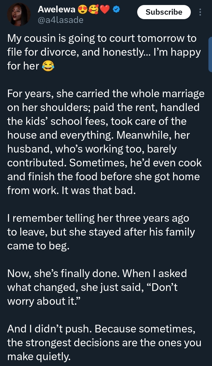 In the viral post, the lady revealed that her cousin is set to file for divorce, expressing happiness over what she described as a long-overdue decision.