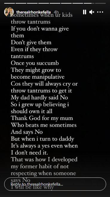 Reacting to a post that rebuked spoiled women by telling them they can never have their way all the time, Ronke narrated how her father made her think she can always have her way because he never opposed her ideas or actions.