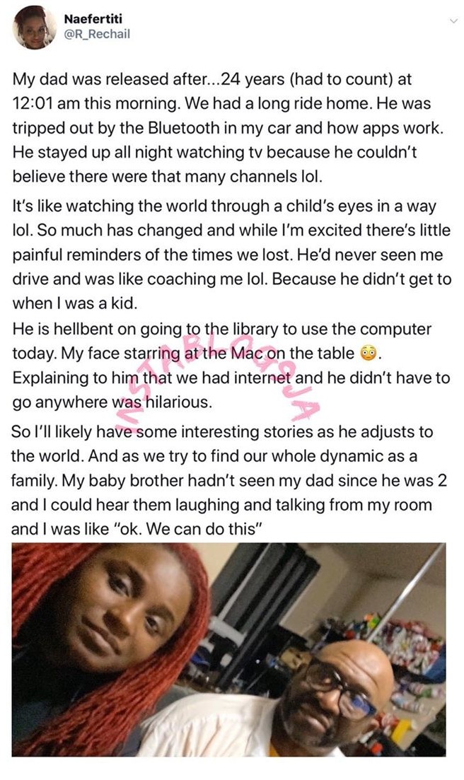 A lady identified as Naefertiti on Twitter has taken to the platform to share her journey through life and how her dad was released after spending 24years in prison.