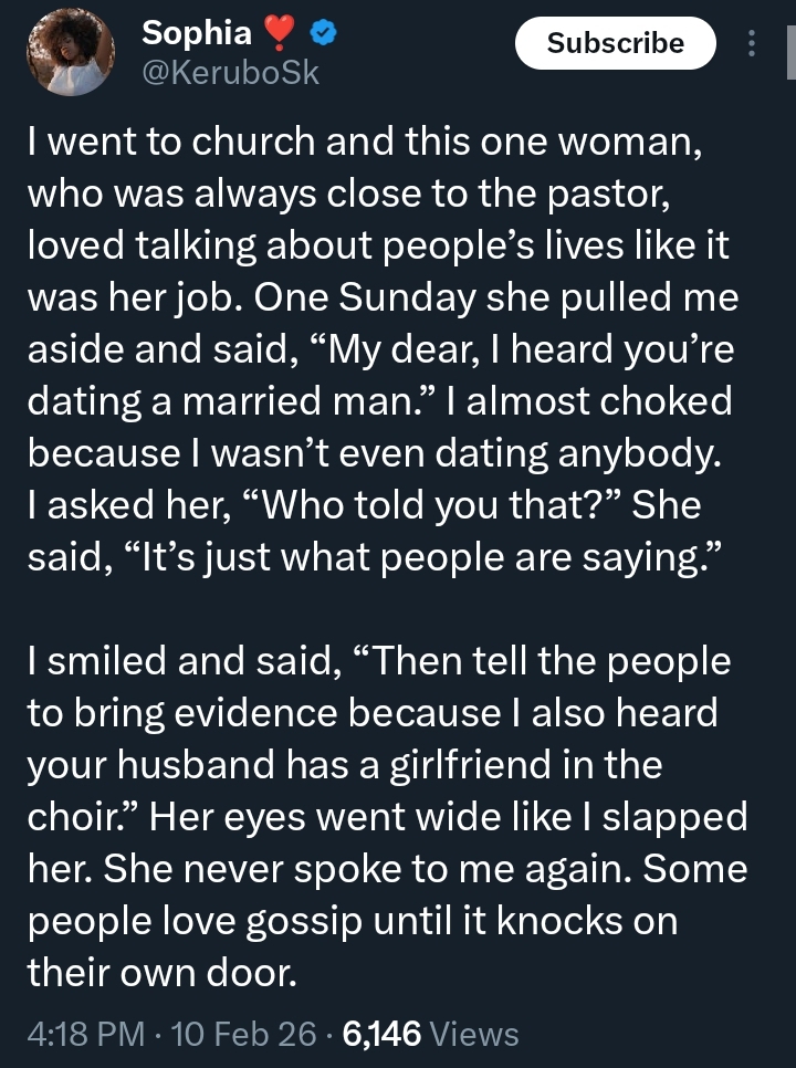 In the post, the lady described how a fellow church member, known for being close to the pastor and gossiping about others, confronted her with an unverified claim about her personal life.