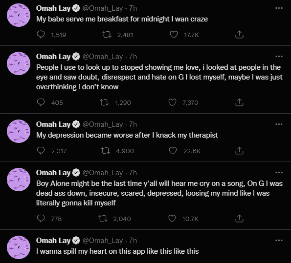 According to Omah Lay, he fell into depression after his babe broke up with him which triggered the need to seek help.
