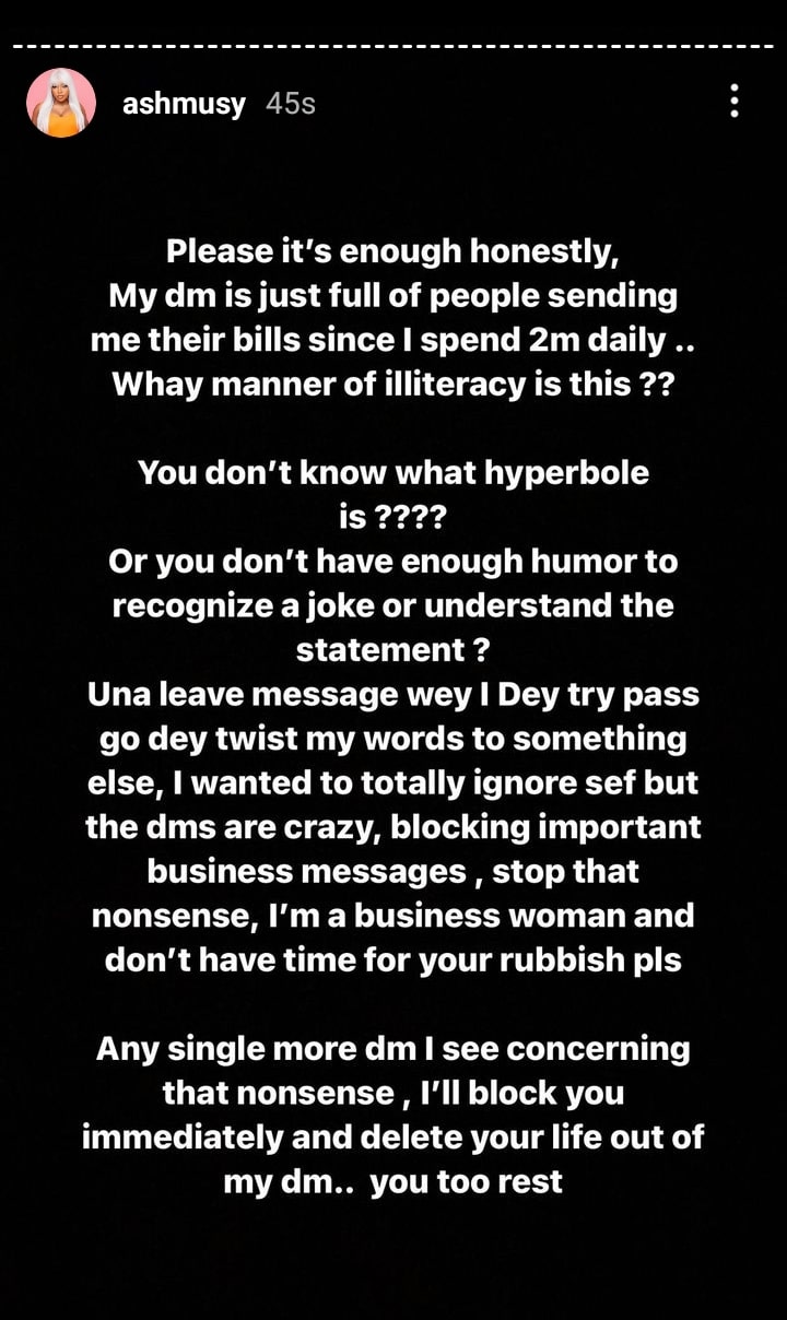 “My DM is full of people sending me their bills since I spend N2M daily” – Ashmusy cries out, dismisses initial claim as joke