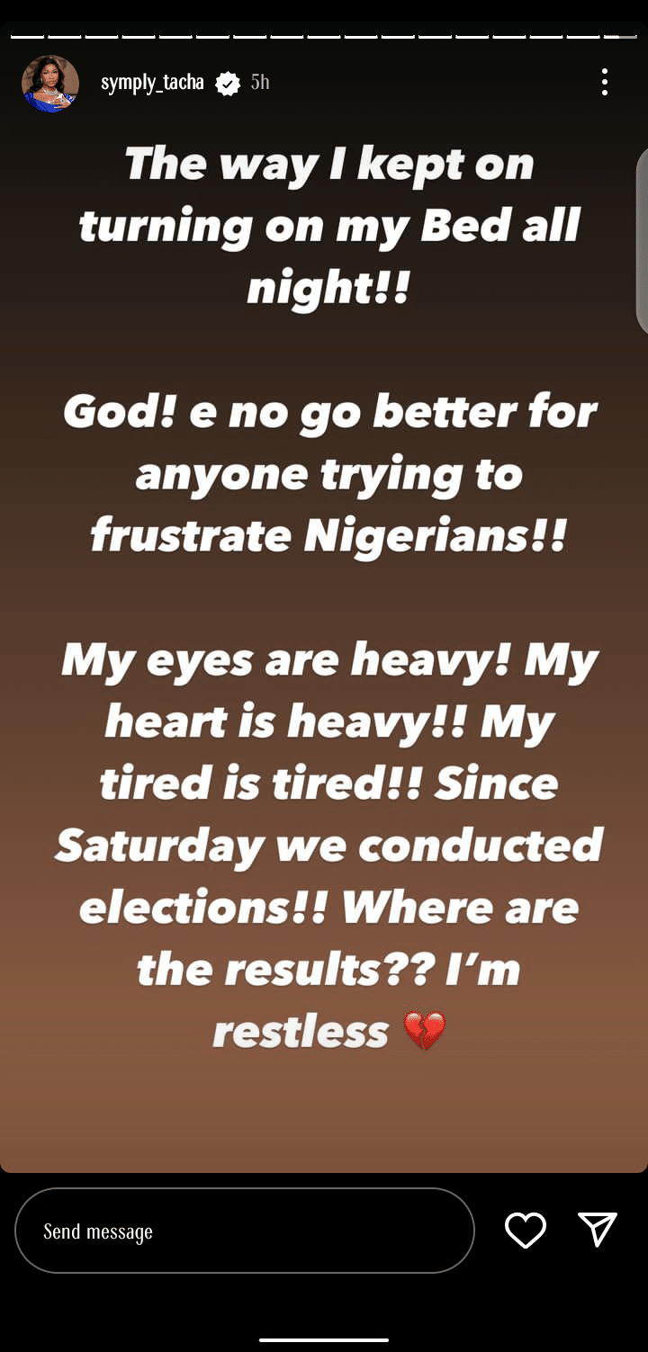 Reality TV star, Natacha Akide, has expressed her frustration while awaiting the results of the 2023 presidential election to be announced.