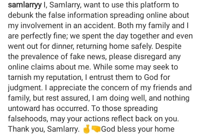 His words: “I, Samlarry, want to use this platform to debunk the false information spreading online about my involvement in an accident. Both my family and I are perfectly fine; we spent the day together and even went out for dinner, returning home safely. Despite the prevalence of fake news, please disregard any online claims about me. While some may seek to tarnish my reputation, I entrust them to God for judgment. I appreciate the concern of my friends and family, but rest assured, I am doing well, and nothing untoward has occurred. To those spreading falsehoods, may your actions reflect back on you. Thank you, Samlarry. God bless your home.”