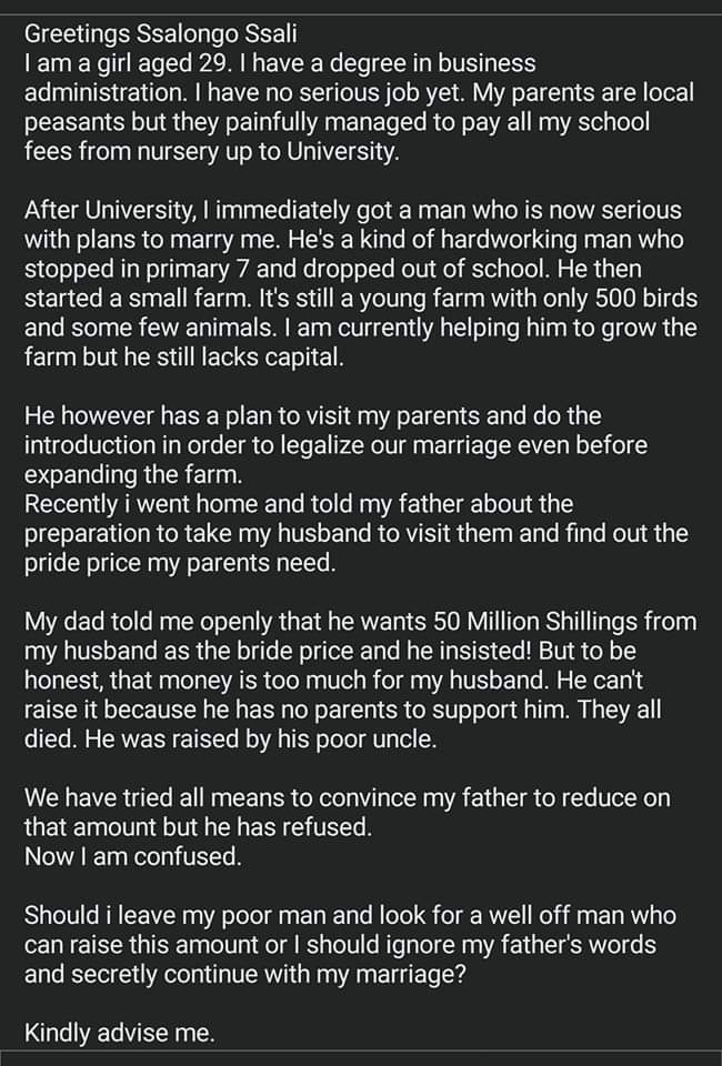 A Kenyan lady has cried out for advice over her father who insists that her fiancée pays 50 million as her bride price.