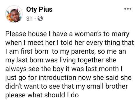 In his post, Pius wrote: “Please house I have a woman to marry. When I met her I told her every thing. That I am first born to my parents, so me and my last born was living together. She always see the boy. It was last month I just go for introduction now. She said she didn’t want to see that my small brother. Please what should I do?”