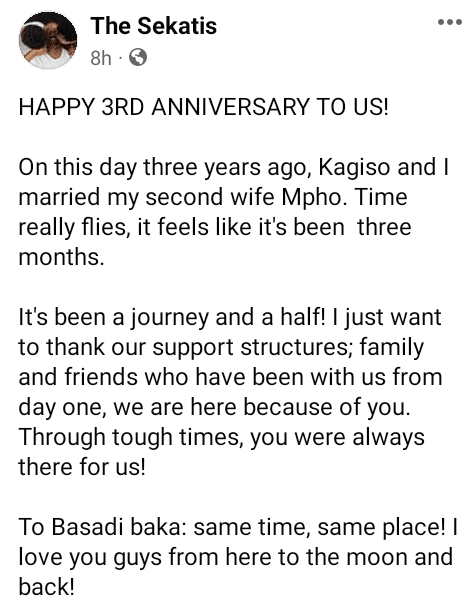 “HAPPY 3RD ANNIVERSARY TO US! On this day three years ago, Kagiso and I married my second wife Mpho,” he wrote.