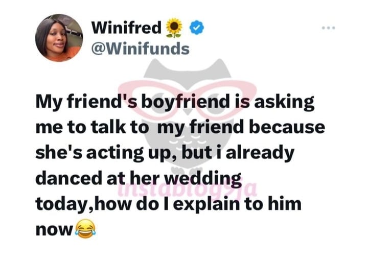 In her words; “My friend’s boyfriend is asking me to talk to my friend because she’s acting up, but i already danced at her wedding today,how do I explain to him now.”