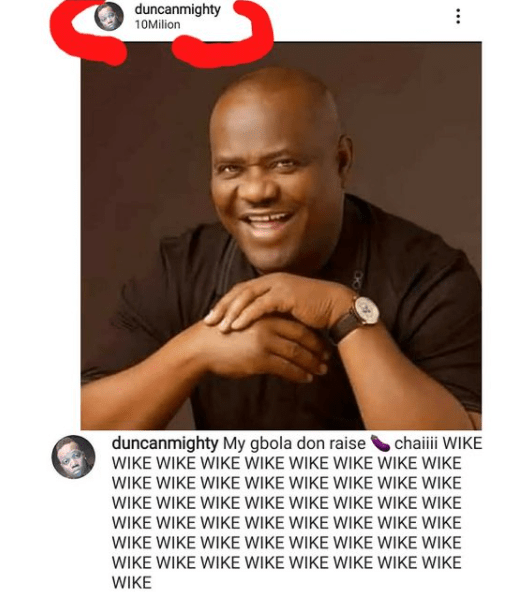 The singer took to his official Twitter page to tweet “my gbola don rise chaii” as he uploaded the picture of River State Governor, Nyesom Wike.