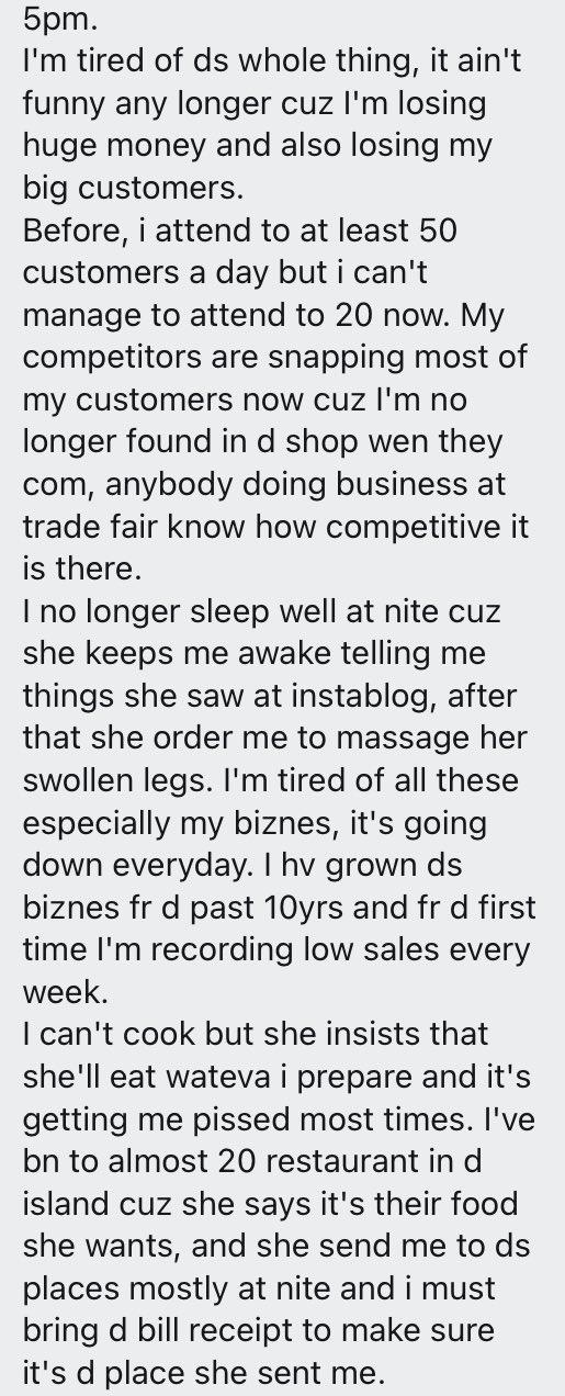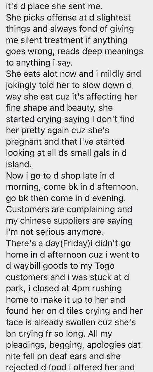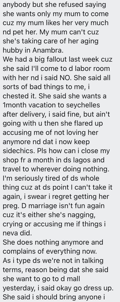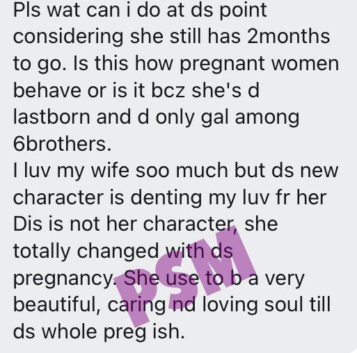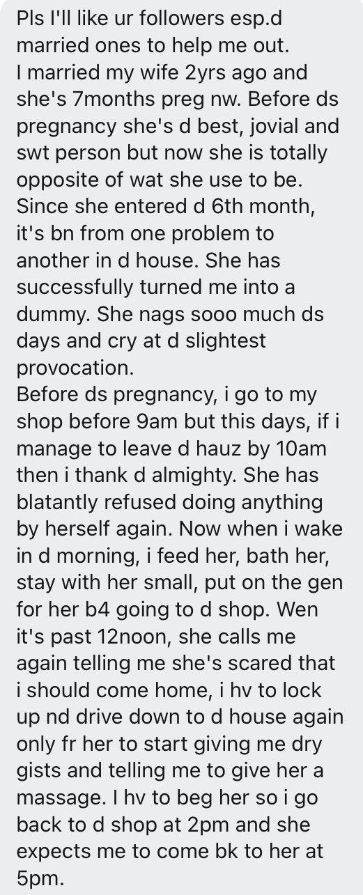 “I married my wife 2yrs ago and she’s 7months preg nw. Before ds pregnancy she’s d best, jovial and swt person but now she is totally opposite of wat she use to be. Since she entered d 6th month, it’s bn from one problem to another in d house. She has successfully turned me into a dummy. She nags sooo much ds days and cry at d slightest provocation…”