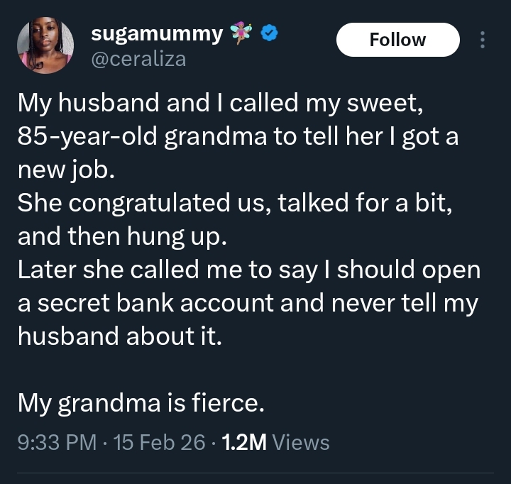 A lady has stirred heated conversations online after revealing unexpected financial advice from her 85-year-old grandmother.