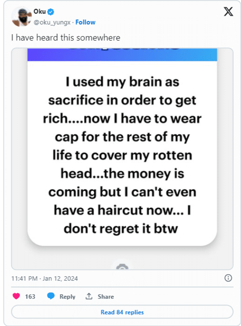“The money is coming but I can’t even have a haircut now… I don’t regret it btw.”