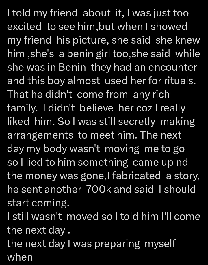 Sharing the aftermath of her friend’s confession, the lady narrated, “So I was still secretly making arrangements to meet him. The next day my body wasn’t moving me to go so I lied to him something came up and the money was gone,I fabricated a story, he sent another 700k and said I should start coming“.
