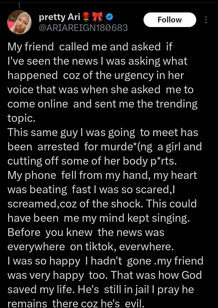 Sharing how she reacted to the discovery, @ARIAREIGN180683 narrated, “My phone fell from my hand, my heart was beating fast I was so scared,I screamed,coz of the shock. This could have been me my mind kept singing. Before you knew the news was everywhere on tiktok, everywhere. I was so happy I hadn’t gone .my friend was very happy too. That was how God saved my life. He’s still in jail I pray he remains there”.