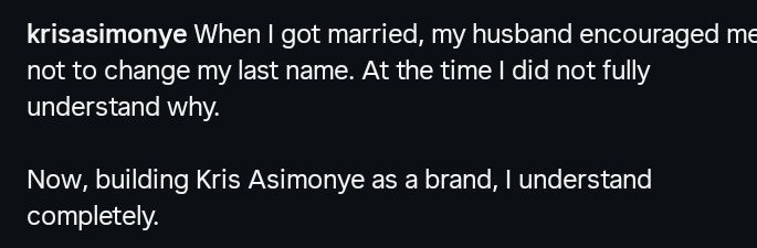 “Now, building Kris Asimonye as a brand, I understand completely,” she added.