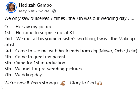 Lady shares her love story of how she and her husband met only 7 times before they got married, as they celebrate their 8th wedding anniversary.