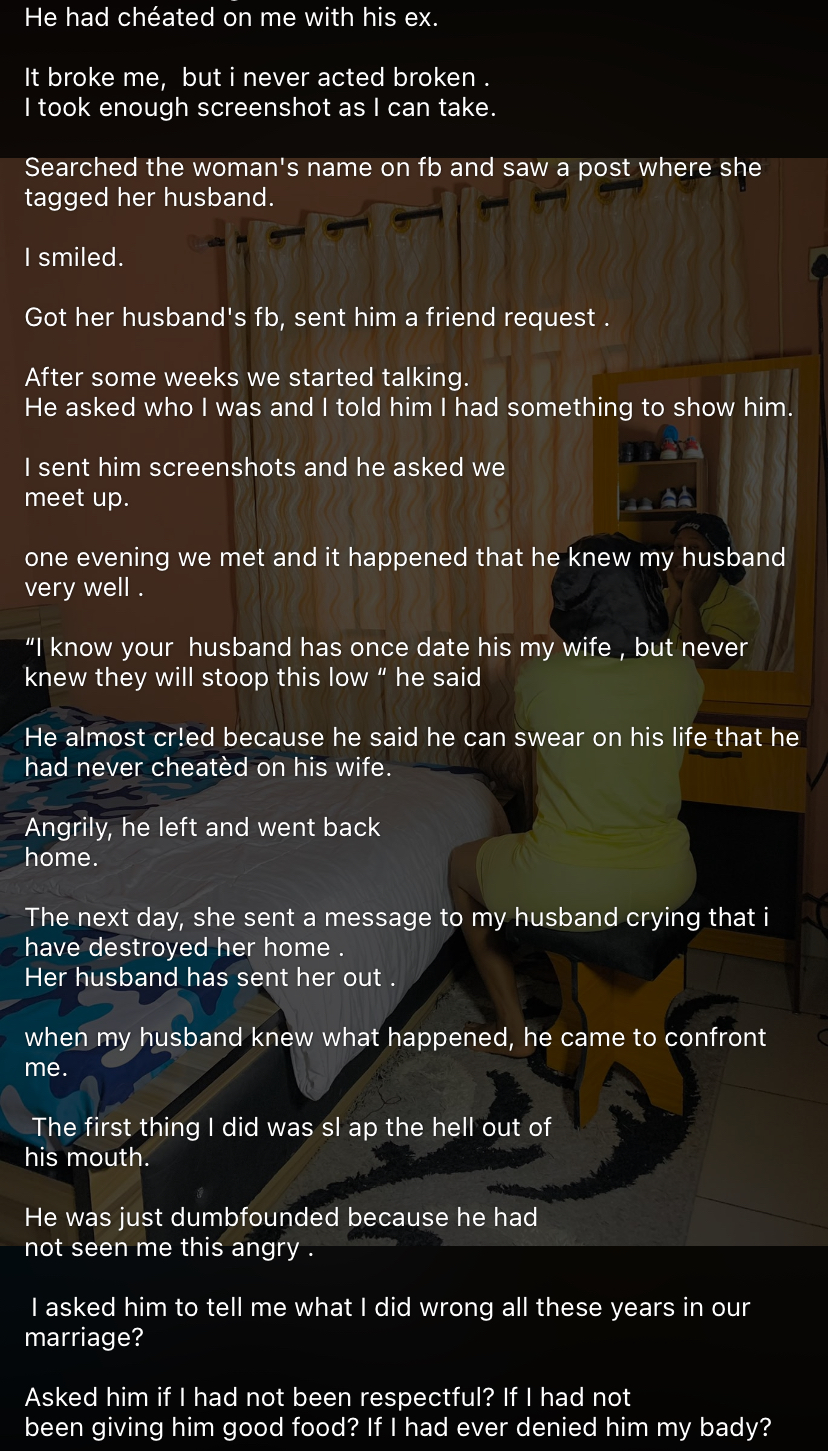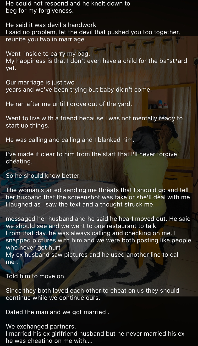 “My husband cheated with his married ex so I married her husband” – Lady shares her revenge story