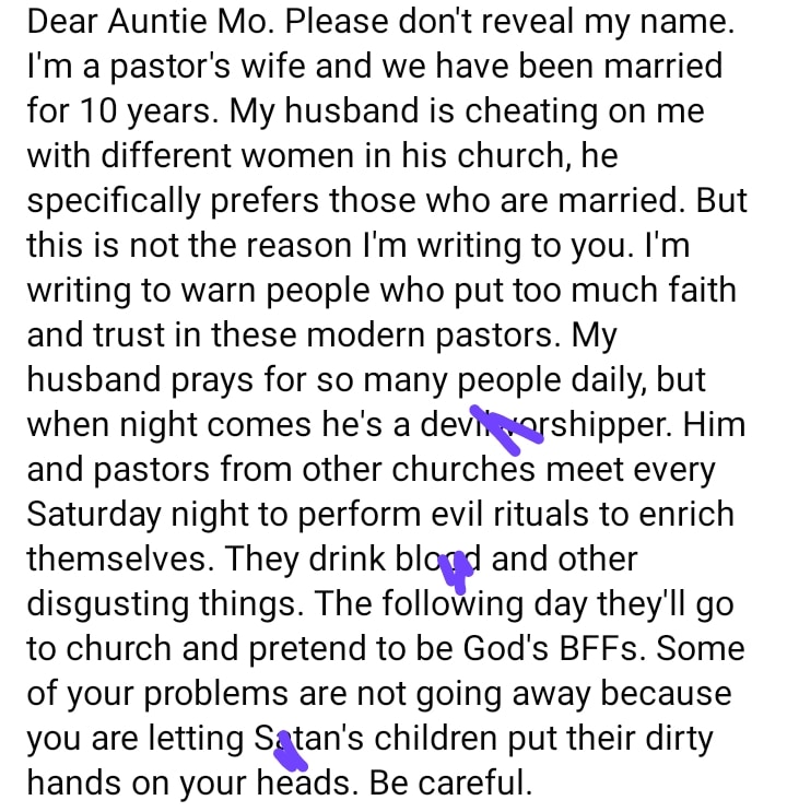 “Dear Auntie Mo. Please don’t reveal my name. I’m a pastor’s wife and we have been married for 10 years. My husband is cheating on me with different women in his church, he specifically prefers those who are married. But this is not the reason I’m writing to you. I’m writing to warn people who put too much faith and trust in these modern pastors. My husband prays for so many people daily, but when night comes he’s a d.ev.ilworshipper. Him and pastors from other churches meet every Saturday night to perform evil rituals to enrich themselves. They drink bl.oo.d and other disgusting things. The following day they’ll go to church and pretend to be God’s BFFs. Some of your problems are not going away because you are letting Sat.an’s children put their dirty hands on your heads. Be careful.”