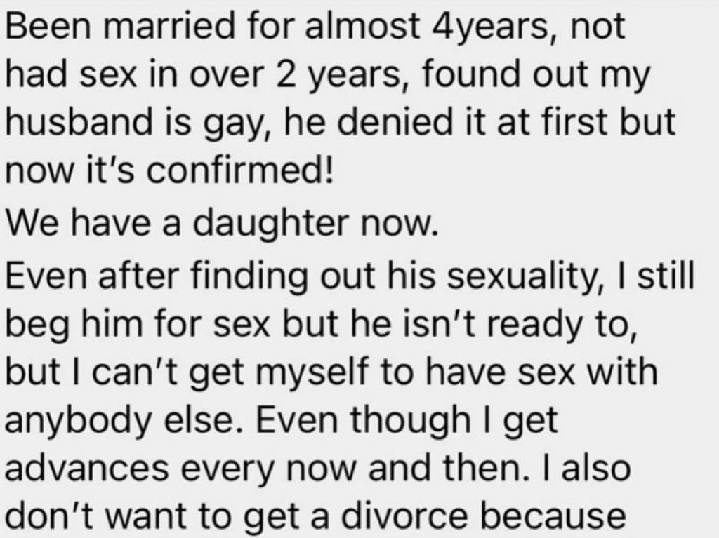 “Been married for almost 4years, not had sex in over 2 years, found out my husband is gay, he denied it at first but now it’s confirmed! We have a daughter now. Even after finding out his sexuality, I still beg him for sex but he isn’t ready to, but I can’t get myself to have sex with anybody else.