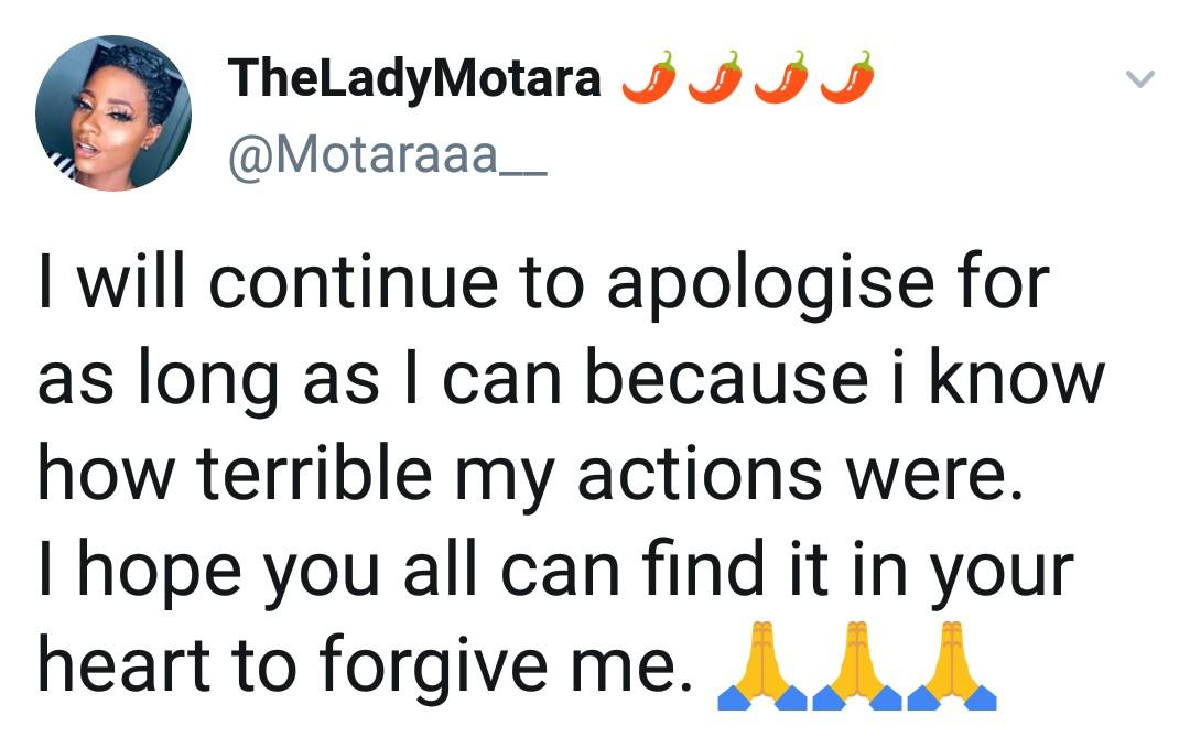 In a recent tweet, Motara apologized with crying emojis, while narrating how her action caused her life to crumble before her eyes.