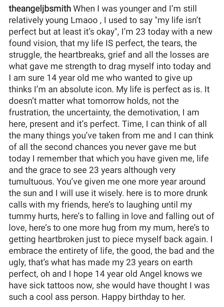 “When I was younger and I’m still relatively young Lmaoo , I used to say “my life isn’t perfect but at least it’s okay”, I’m 23 today with a new found vision, that my life IS perfect, the tears, the struggle, the heartbreaks, grief and all the losses are what gave me strength to drag myself into today and I am sure 14 year old me who wanted to give up thinks I’m an absolute icon. My life is perfect as is. It doesn’t matter what tomorrow holds, not the frustration, the uncertainty, the demotivation, I am here, present and it’s perfect. Time, I can think of all the many things you’ve taken from me and I can think of all the second chances you never gave me but today I remember that which you have given me, life and the grace to see 23 years although very tumultuous. You’ve given me one more year around the sun and I will use it wisely. here is to more drunk calls with my friends, here’s to laughing until my tummy hurts, here’s to falling in love and falling out of love, here’s to one more hug from my mum, here’s to laughing until my tummy hurts, here’s to falling in love and falling out of love, here’s to one more hug from my mum, here’s to getting heartbroken just to piece myself back again. I embrace the entirety of life, the good, the bad and the ugly, that’s what has made my 23 years on earth perfect, oh and I hope 14 year old Angel knows we have sick tattoos now, she would have thought I was such a cool ass person. Happy birthday to her.”