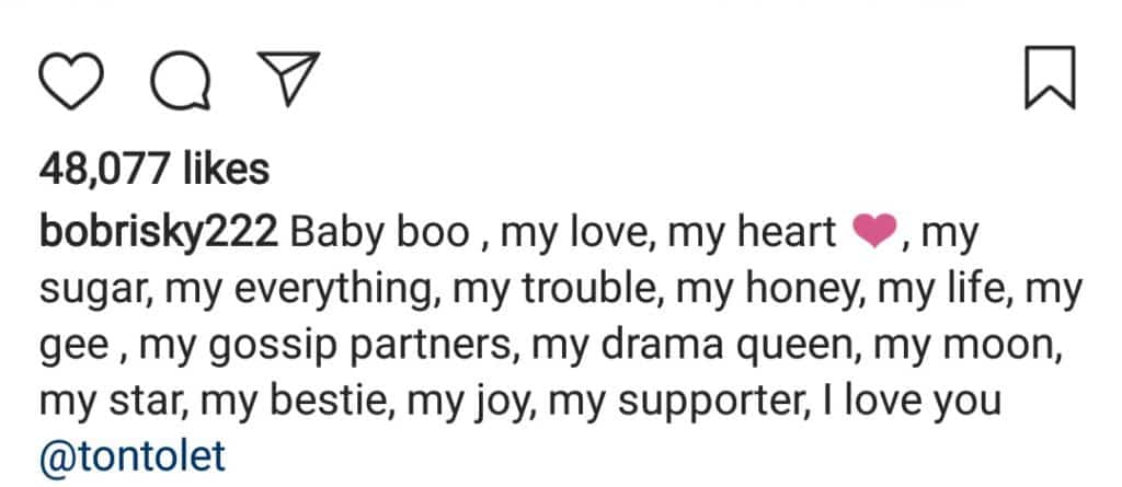 Bobrisky, while gushing over the on-screen character, addressed her as his love, heart, joy, amongst others. He also expressed his love for Tonto. ‘I love you Tonto’, he wrote.