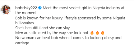 Bob is known for her luxury lifestyle sponsored by some Nigeria billionaires.