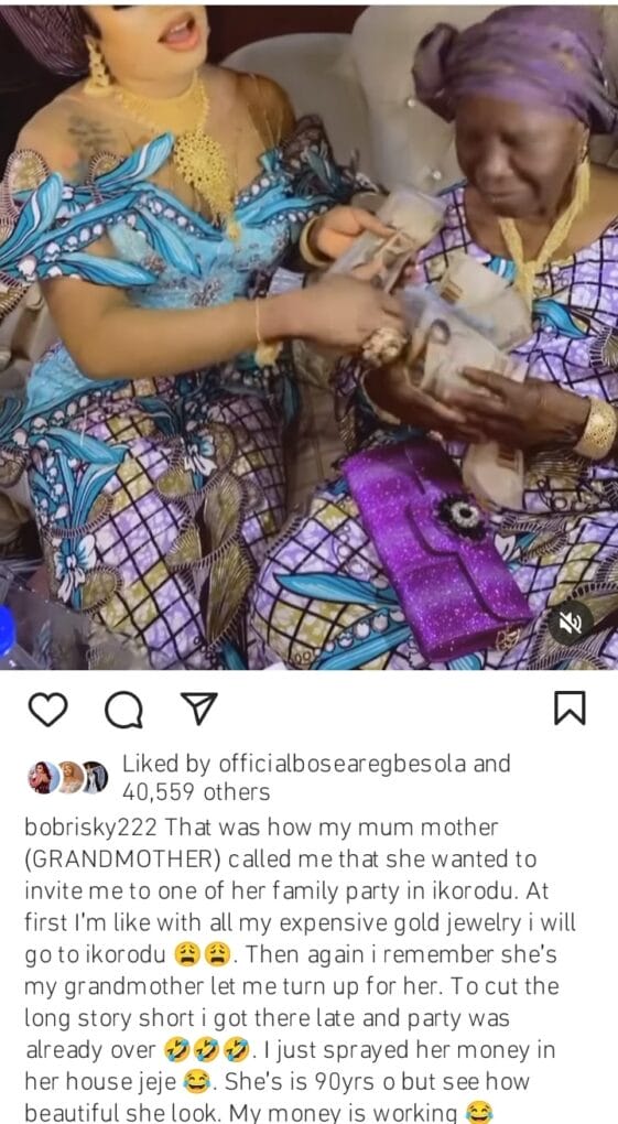 “That was how my mum’s mother (grandmother) called me—she wanted to invite me to one of her family parties in Ikorodu. At first, I’m like with all my expensive gold jewelry I will go to Ikorodu. Then again, I remember that she’s my grandmother let me turn up for her. To cut a long story short I got there late and the party was already over. I just sprayed her money in her house jeje. She is 90 years old but see how beautiful she looks. My money is working”.