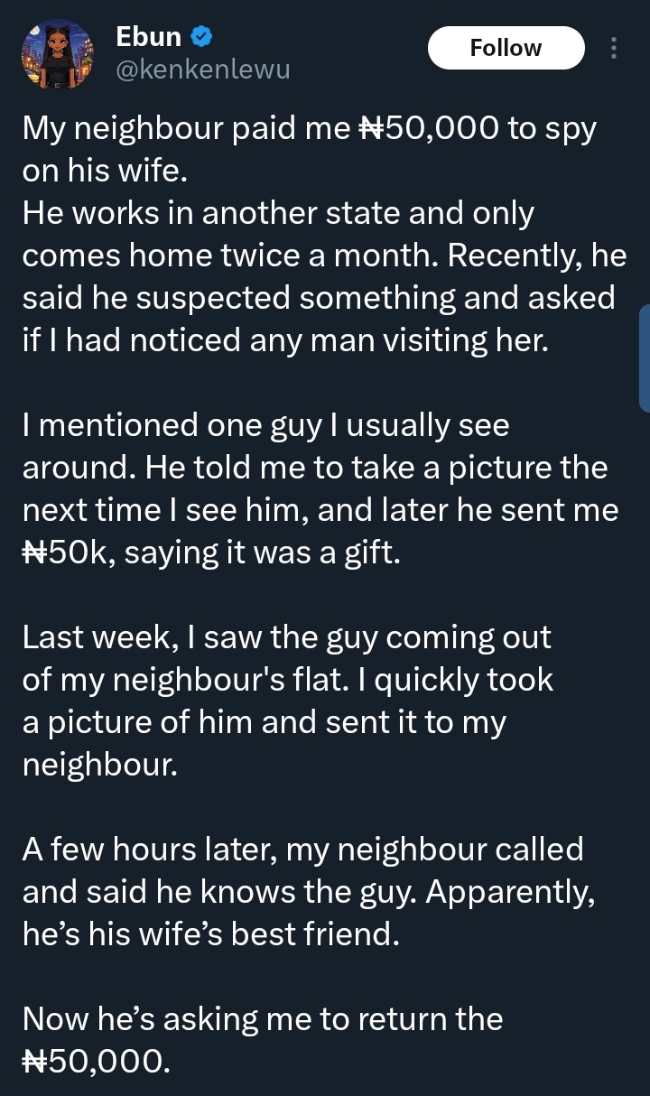 In a post shared on X, formerly known as Twitter, the lady said she was paid ₦50,000 to spy her neighbour’s wife while he was away for work.